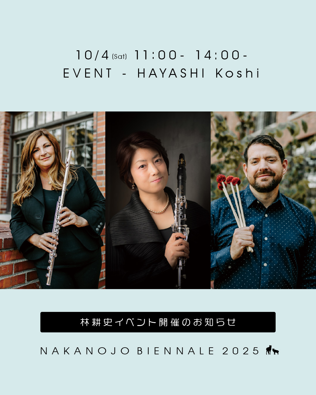 ビエンナーレ会場のなかで一番空に近い場所、「花楽の里」。フルート、クラリネット、パーカッションによるナチュラルな響きが風のように木々の間を翔けていきます。彫刻と音楽と自然の声が一体となるしっとりとした場をお楽しみください。2017 年ライヴで爽やかな演奏を披露したトリオが、満を持しての再登場です。